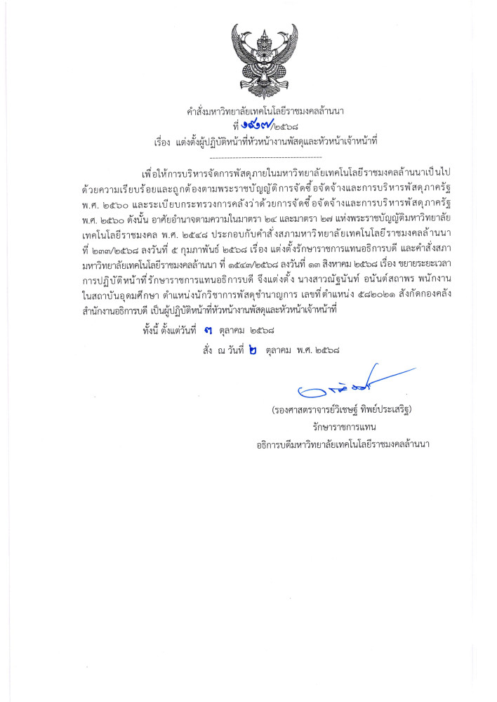 แจ้งเวียนคำสั่งมหาวิทยาลัยเทคโนโลยีราชมงคลล้านนา เรื่อง แต่งตั้งผู้ปฏิบัติหน้าที่หัวหน้างานพัสดุและหัวหน้าเจ้าหน้าที่